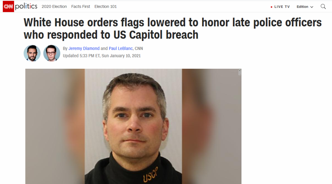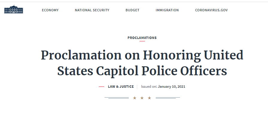 在一份于当地时间1月10日发布在美国白宫官网上的公告中,美国总统特朗普表示为了悼念“牺牲”的美国国会警察布莱恩·西柯尼可(Brian D. Sicknick)和霍华德·利本古德(Howard Liebengood),并向美国国会警察以及全美国所有的执法机关致以“敬意”,他已经下令让包括美国白宫在内的美国各政府机构、军队和使领馆等驻外机构降半旗3天。