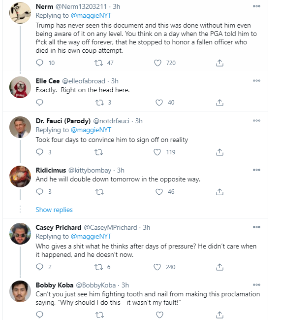 还有人认为,白宫应该在这份以特朗普的总统名义发布的公告中加入警察“是被特朗普的暴徒杀死”和“我引咎辞职”这样的内容才准确,否则这个公告就只是一份“政治宣传品”而已。