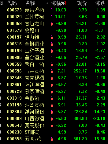 白酒股集体下杀,酿酒板块大幅走低,惠泉啤酒、兰州黄河、古越龙山、会稽山等跌停,粗略算了一下,单单是白酒板块,最近两个交易日已经蒸发了3000亿左右。