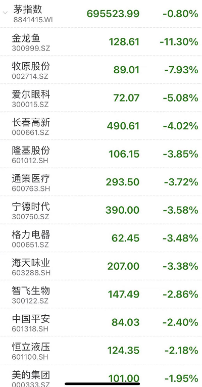 另外,各种“茅台”也出现大跌。其中“油茅”金龙鱼的股价一举拿下145.62元/股的历史新高后便一路下挫,午后开盘大幅跳水超13%。截至收盘,股价仍大跌11.3%,成交额高达116亿元,最新总市值6973亿元。