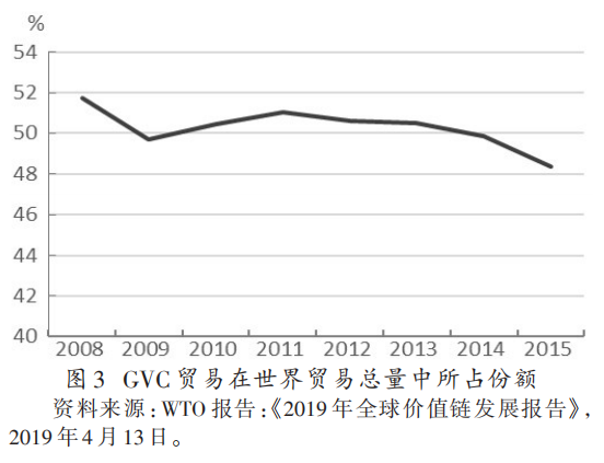 具体表现为2008年GVC贸易在全球贸易总量中所占份额明显下降,2010年以后虽有恢复,但近年逐渐步入下行轨道-这一现象表明以大规模跨国投资驱动、高增长中间品贸易为特征的全球价值链步入深度调整期(见图3)。