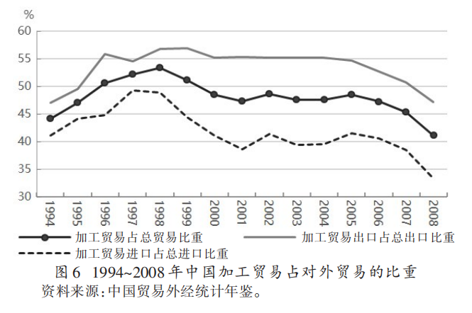 1995~2008年,全球价值链贸易(以下简称“GVC贸易”)在全球贸易总量中所占份额不断增加,增长最为迅速。到2008年GVC贸易已超过全球贸易的一半(见图1)。