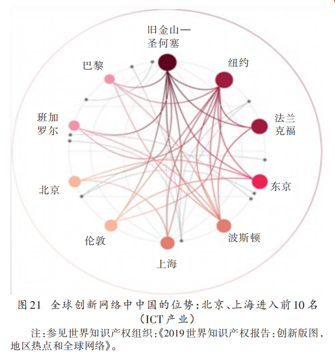 世界知识产权组织的调研也显示出中国在跨国公司全球研发网络中重要性的提升,20世纪90年代,在全球创新网络中,中国的贡献大约只有1%的专利,而在2015~2017年期间,中国贡献了大约15%的专利(见图20)。中国的一些城市更是成为了全球创新合作网络中的关键节点,在ICT产业全球十大创新网络中,北京、上海都已经处于其中(见图21)。
