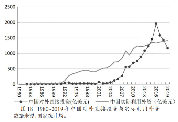 面对土地、淡水、环境容量等自然资源的日益稀缺,劳动力成本日益提高,相当部分的资金继续在本土配置,会达不到最佳状况,降低资金收益。这种情况下,投资者开始向外转移,寻求有更高回报的投资地点,这是资本追逐利润的必然结果。这种转移有利于阻止本土投资收益率的持续下降,稳定资本收益。因此,对外投资加速有其内在强劲动力。从图18中可以看出,中国作为跨国投资东道国的地位和作为跨国投资输出国的地位,已经出现替换趋势。