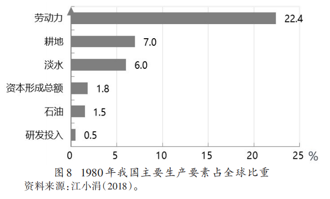 我国持续多年的高积累率,资本存量高速增长。特别是近10年来,国内资金成为相对充裕的生产要素,存量资本和每年新增储蓄都达到巨大规模。2018年,我国资本形成总额达到39.7万亿人民币,约合5.4万亿美元,占全球资本形成总额的比重已达25.8%。与我国6%的淡水资源、7%的可用土地资源、3%的石油资源相比,甚至与20%左右的劳动力资源相比,资本已经是相对充裕要素。