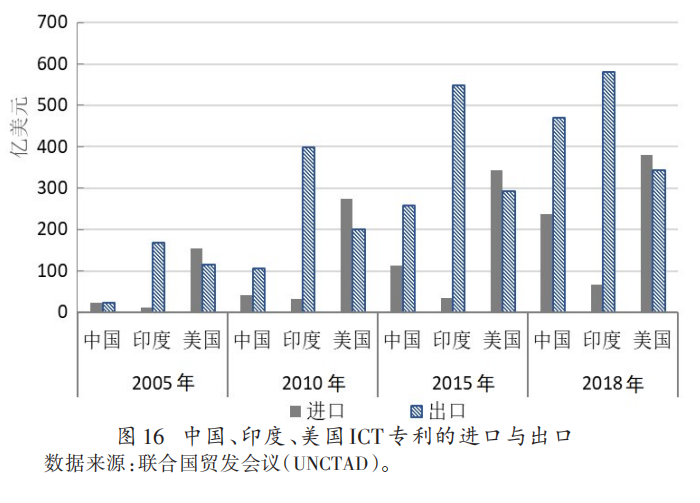 图16是美国、中国和印度三国ICT专利进出口的情况,可以看到,美国的进口和出口大致平衡,中国和印度都是出口明显大于进口。这并不能说明中国和印度的ICT产业技术水平高于美国。美国这样的技术强国却大量引进技术,这并不难理解。