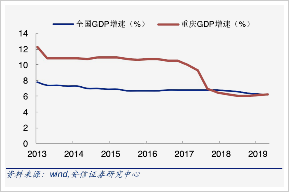 2018年以前,在汽车业的拉动下,重庆GDP增速常年高于全国平均水平;2018年以后,受汽车业持续低靡影响,重庆GDP增速也下跌至平均线以下。