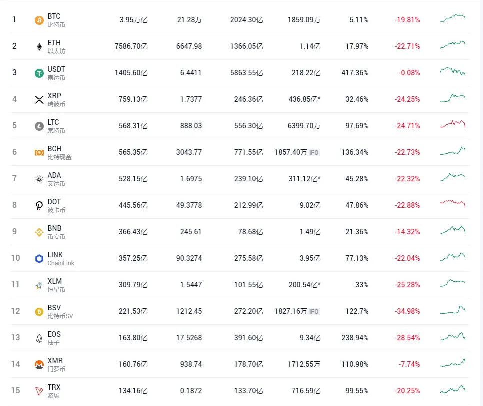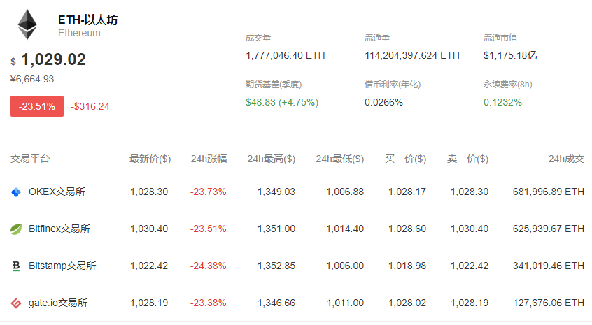 其余加密货币也跌势不止,截至北京时间11日15:19,以太坊跌近24%,下破1030美元/枚。