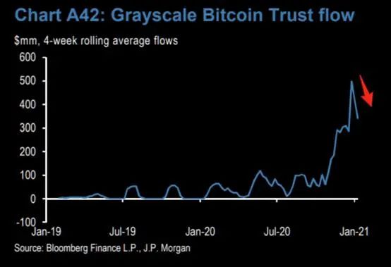 。摩根大通警告,如果流入“灰度信托”的资金数量大幅放缓,比特币回调的概率将大增,出现类似2019年的大幅回调将不可避免。