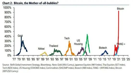 “比特币在过去两个月涨了180%,整个数字货币市场市值已超过1万亿美元。如果我们将最近这几十年来的泡沫进行可视化,比特币毋庸置疑就是‘泡沫之母’。