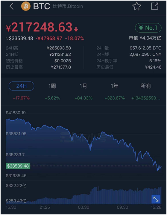 11日下午,据Bitstamp,比特币一度跌破33000美元/枚,24小时跌幅超20%。截至北京时间11日15:19,比特币价格在33310.45美元/枚,日内已跌去18.74%。