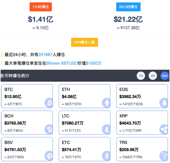 加密数字货币市场有20万人爆仓,爆仓金额达137亿。