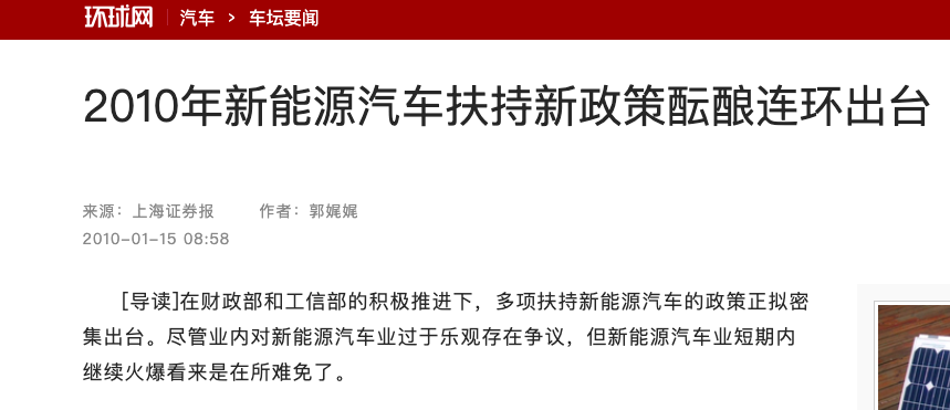 2009年,政府宣布扶持新能源汽车发展,2010年开始提供财政补贴。