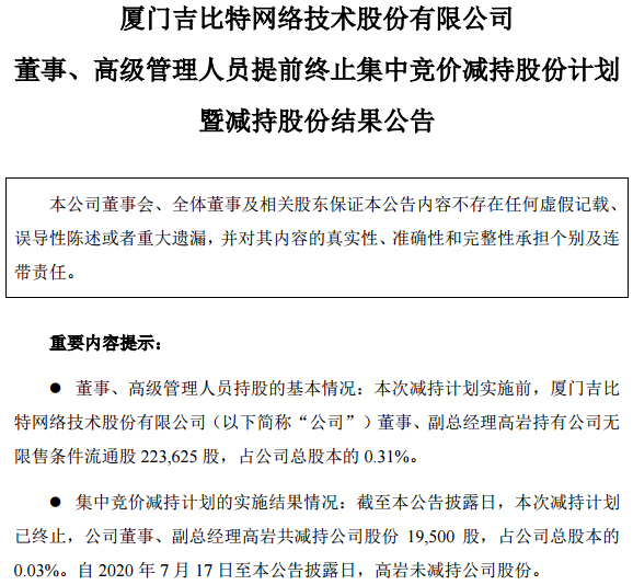 不知道是不是为了“稳定军心”,在吉比特股价跌跌不休的时候,公司有高管已决定提前终止减持计划。