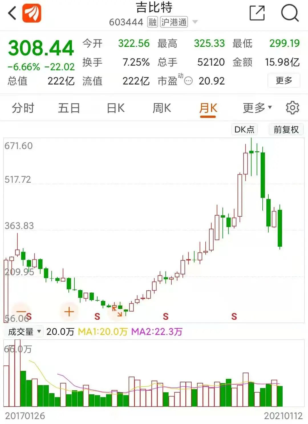 没想到,在股价创出历史新高后,吉比特经历短暂的盘整后,股价开始极速走低,期间还多次上演跌停戏码,截至1月12日收盘,股价报收308.44元,较671.6元的历史最高价,跌去54.1%。换句话说,吉比特在涨了近8倍之后,短短的5个月时间,股价直接腰斩。