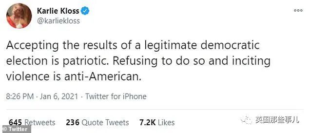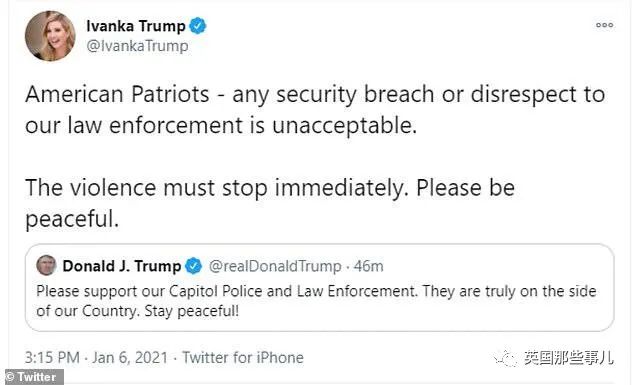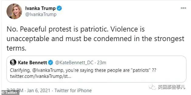 回到1月6日,当抗议者们攻占美国国会大厦的进程正酣时,伊万卡曾发表过这样一则推特:
