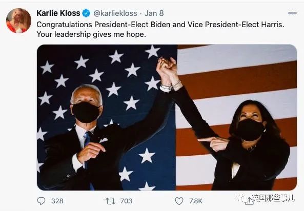 “对当选总统拜登和副总统哈里斯表示祝贺,有你们领导,让我看到了希望。”