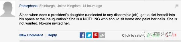 “从什么时候开始,一个总统女儿(没看出她有任何别的工作),需要在就职典礼上有一席之地了?她一无是处,应该在家里涂涂指甲,没人欢迎她,也没人邀请她。”