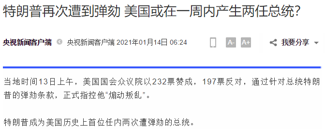 此前,美国副总统彭斯拒绝了众议院议长南希·佩洛西和其他民主党人提出的援引宪法第25条修正案来解除特朗普总统职务的呼吁。彭斯在12日晚公布的致佩洛西的信中写道:“我不认为这样的行动符合我们国家的最佳利益,也不符合宪法。”