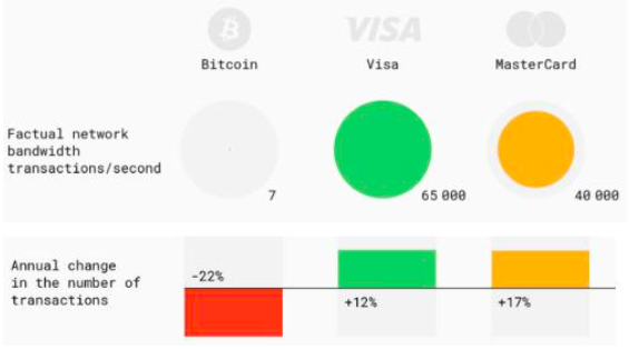 已经诞生12年的比特币,和美国visa信用卡以及万事达的交易量比起来,简直可以忽略不计,你几乎看不到那个红点的存在。