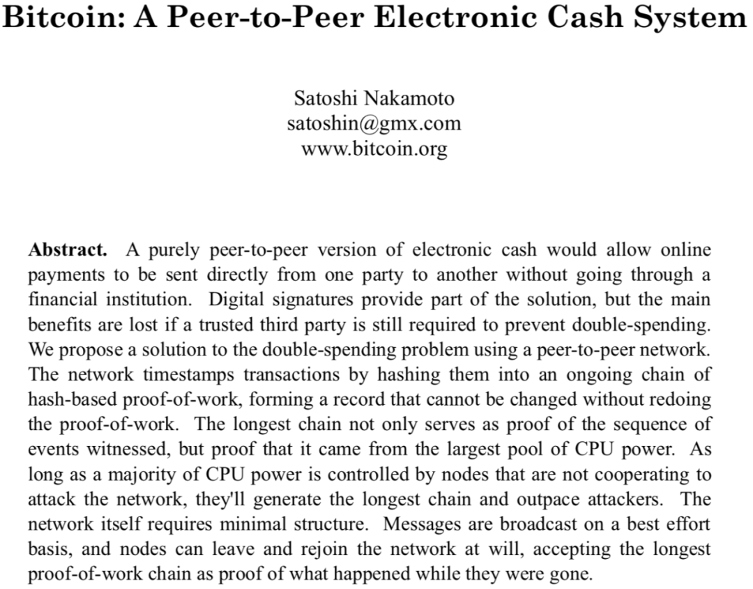 2008年,全球金融危机爆发,11月1日,一个自称中本聪的人发布了比特币白皮书《比特币:一种点对点的电子现金系统》。
