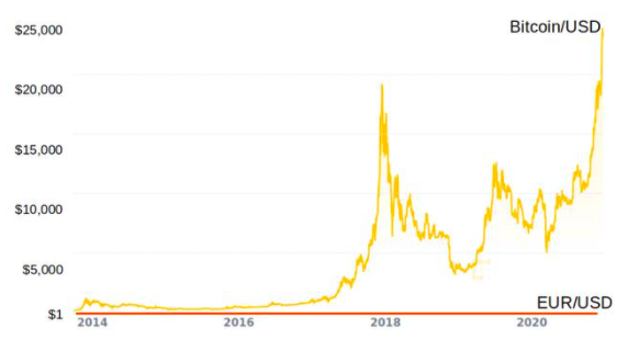 它和美元之间的汇率波动,就像是在坐过山车,而作为一种法定货币,欧元和美元之间却是一条平滑的直线。