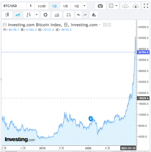 2021年1月8日,比特币的收盘价是40599.3美元,创下历史新高。
